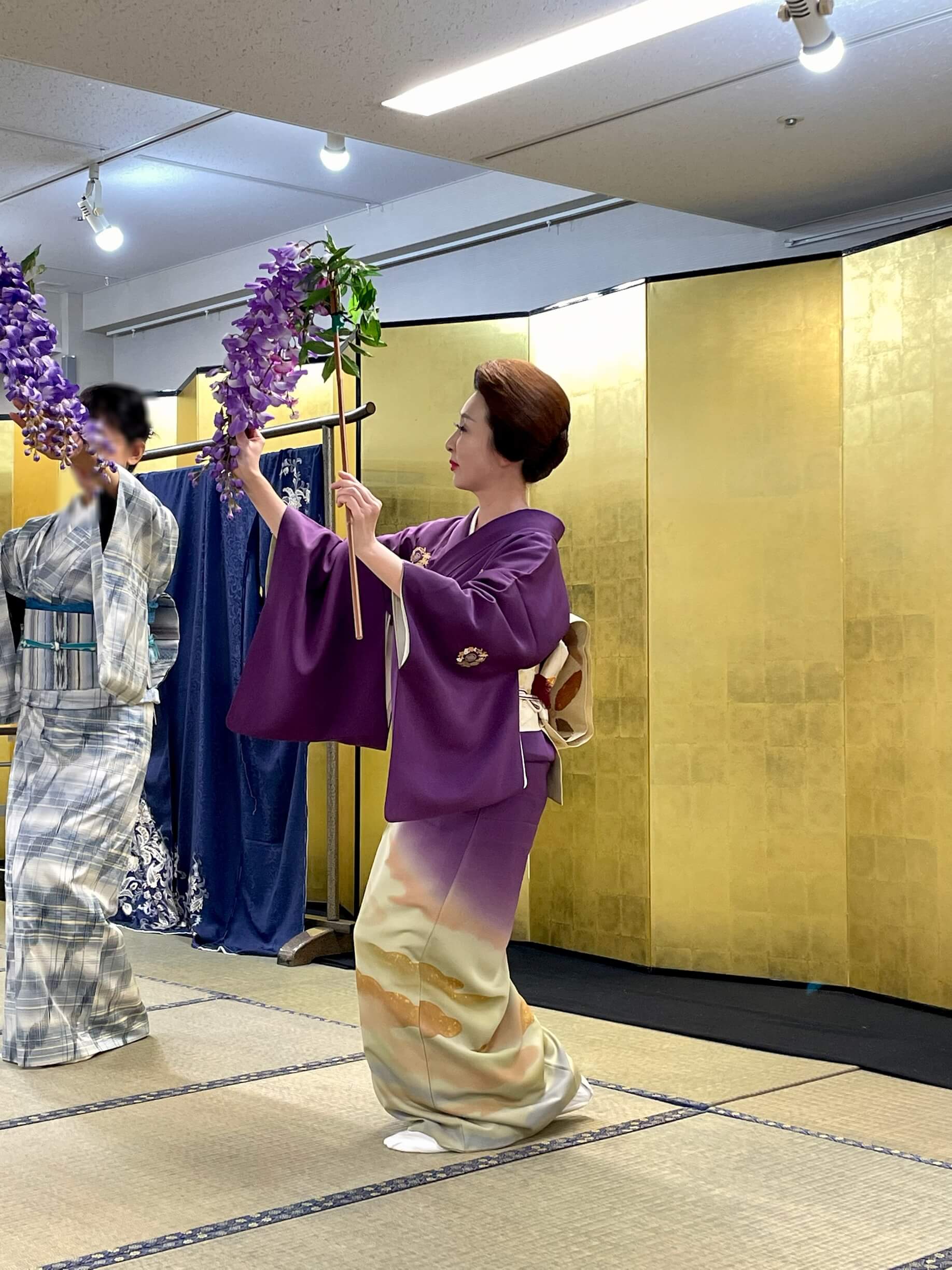 当日は、藤の花枝や塗笠を持ち、映画国宝のお役者お二人の舞踊ポーズなどを取り入れ、日本舞踊の体験と撮影会をさせて頂きました。